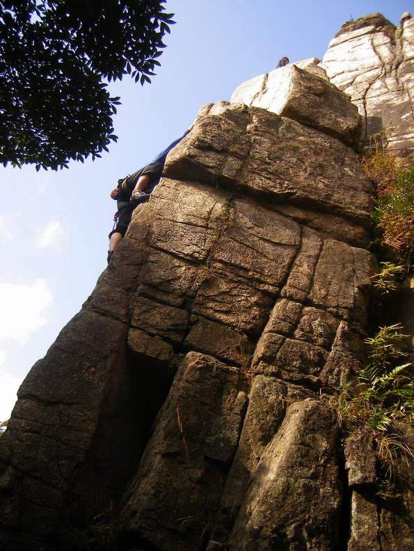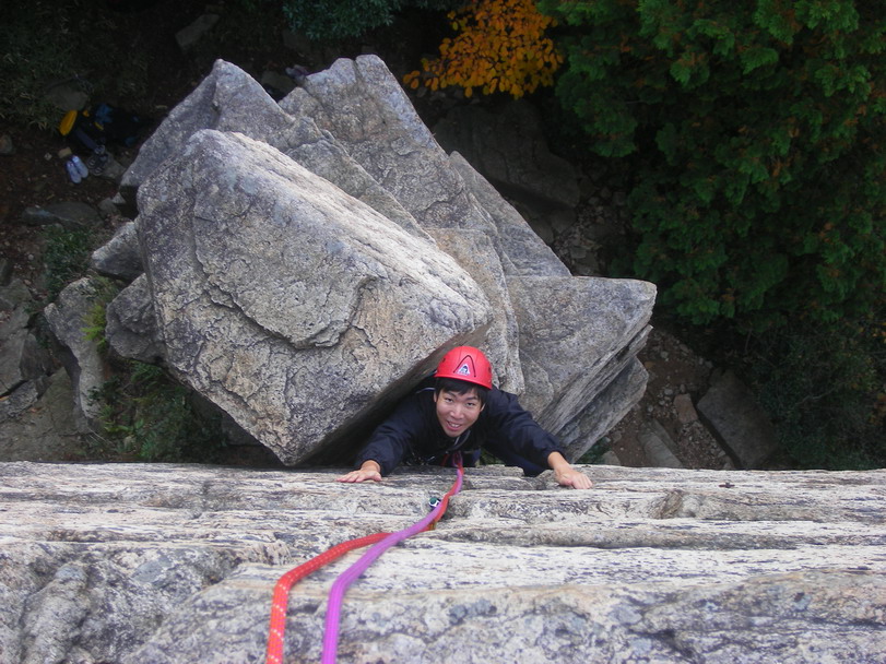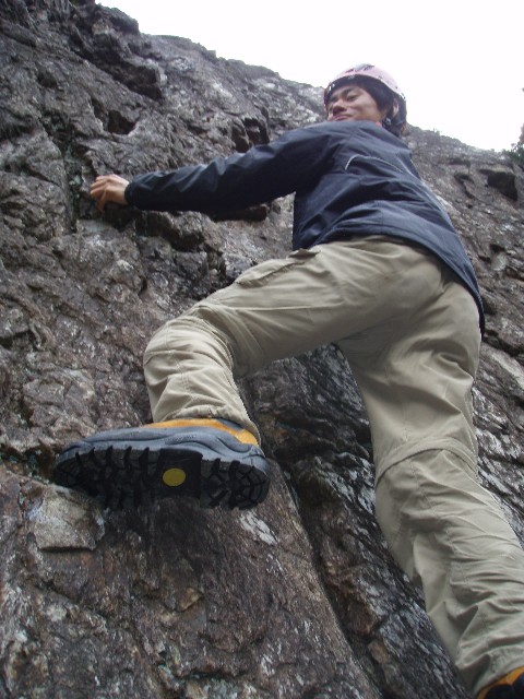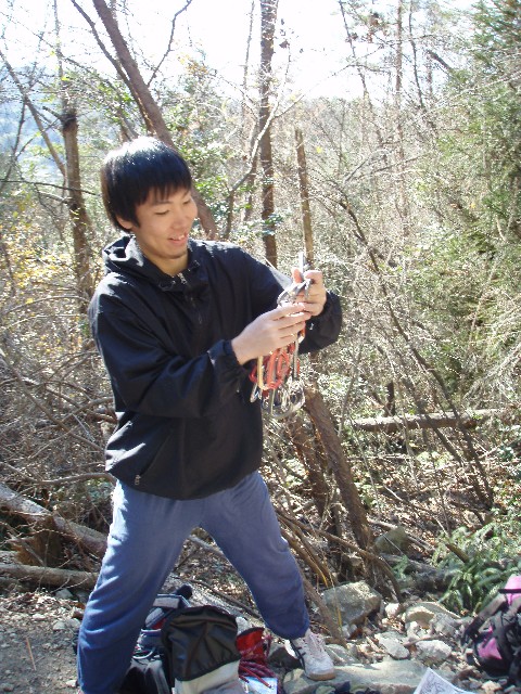 とりあえず、星野が岩峰会ルート(5.9)にトライ。岩が冷たいらしく「い、岩が…ゆ、指の感覚が…」なんて言い出した。たしかに温かいわけではない。けど…そんなの関係ねぇ!!登れ登れ!と、喝を入れる。テンションかけながらも何とか上まで上がりトップロープ設置。次にトップロープで伊藤が登る。が、これまたテンション。星野が再びトライするが核心でテンション。伊藤はトップロープながら2トライ目で上まで登れた。